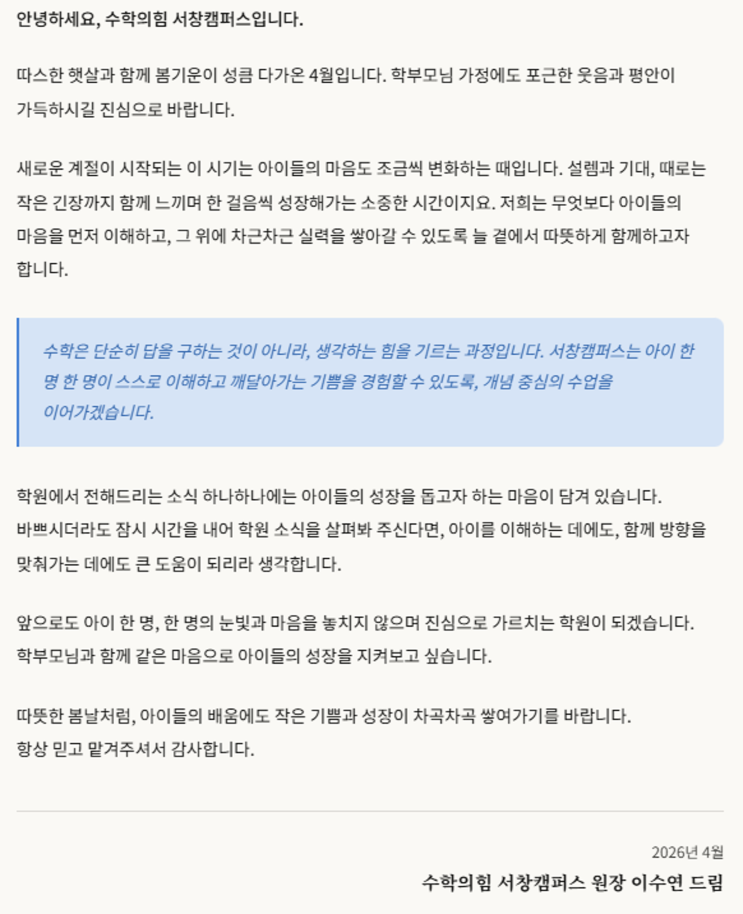 수학의힘 서창캠퍼스 | 2026년 4월의 편지