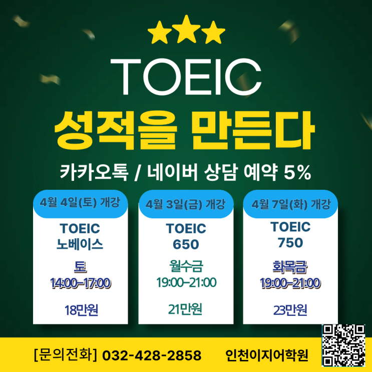 안녕하세요 인천이지어학원 [토익전문학원] 입니다. ⭐ TOEIC 성적을 만든다! ⭐ 카카오톡 / 네이버 상담 예약 시 5% 할인 혜택 개강 일정 ✔ 4월 4일(토) 개강 – TOEIC 노베이스 토요일 14:00~17:00 수강료 18만원 ✔ 4월 3일(금) 개강 – TOEIC 650 월·수·금 19:00~21:00 수강료 21만원 ✔ 4월 7일(화) 개강 – TOEIC 750 화·목·금 19:00~21:00 수강료 23만원 상담은 아래 연락주세요!! 네이버 상담 예약 ↓↓↓↓↓↓↓↓↓↓↓↓↓↓ 카카오톡 상담 ID 2858jd 문의전화: 032-428-2858 인천이지어학원 <img src="https://blogthumb.pstatic.net/MjAyNjA0MDJfMjU0/MDAxNzc1MTE2NDQ2MDM0.k6pS0bhb0LK9_PNXBv1DU33CixMHsA3-LAfFFnrzRZ0g.yMmnzGK_Sew6y24RCtXtRoSipyTYZeAg0_jSLdQ1V7Yg.PNG/%C1%A6%B8%F1%C0%BB_%C0%D4%B7%C2%C7%D8%C1%D6%BC%BC%BF%E4._-_2026-04-02T165240.372.png?type=s3" />