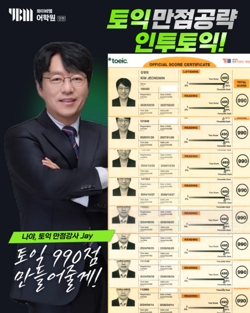 이 후기는 토익 RC에서 특히 Part 5가 늘 어려웠고, 공부를 해도 점수가 쉽게 오르지 않아 RC 자체가 부담이었던 수강생이 YBM 인천 인투토익 제이쌤 수업을 두 달 반째 수강하며 RC 점수와 독해 속도 모두 확실한 변화를 체감한 내돈내산 수강 후기입니다. 수업을 듣기 전까지의 RC는 문제를 많이 풀면 늘겠지 라는 막연한 기대만 있었고, 틀린 문제를 다시 봐도 왜 틀렸는지 정확히 짚지 못한 채 넘어가는 경우가 많았습니다. 특히 Part 5는 문제를 빠르게 풀어야 한다는 압박 때문에 찍다시피 넘어가는 문제도 적지 않았는데요. 하지만 제이쌤 수업을 들으면서 RC를 대하는 관점 자체가 바뀌기 시작했습니다. 문법을 단순히 외우는 게 아니라....... <img src="https://blogthumb.pstatic.net/MjAyNjAxMzFfMjky/MDAxNzY5ODIwNTM3NDkx.kp3Gn_TF5sDREhNfdEPmZNYS9o8ztKfDsLKFb-t1luYg.982Zy6oGDwczb9p9Aa7NEYm2T-7nfKKNf9TxErN0ppwg.PNG/image.png?type=s3" />