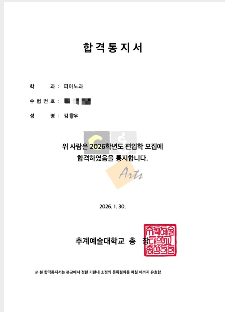 2026학년도 추계예술대학교 피아노과 * 편입 합격 * 남들보다 늦게 20대에 클래식피아노에 도전해서 1년도 안되어 실기명문 추계예대에 합격한 0우씨!✨️ 타 대학 4학년으로 졸업작품도 준비하고, 틈틈이 아르바이트도 병행하면서, 레슨과 연습을 절대 빠지지 않고, 낯설디 낯선 생전 처음 해보는 입시평가회도 참가하면서, 남들이 쉬고 놀때 착실히 준비한 결과가 감사한 합격이라는 선물이 되어 돌아왔습니다. 이 멋지고 아름다운 도전이 귀중한 열매로 맺을 수 있게 앞으로 응원합니다! 정말정말 축하해요 - 김0우 - 합격을 진심으로 축하합니다! "모차르트음악학원은 당신의 음악 여정 곁에 있습니다." 궁금하신 점은....... <img src="https://blogthumb.pstatic.net/MjAyNjAyMDFfMTYx/MDAxNzY5OTI1OTExNjIx.M54QKcB9wMur_vjCUGJFipm-MW6o_Ti5DrfVk8m4434g.ZNSTMwfqsfqfUc_jhqw4FbuCEt6-B4_ucWA4CwplC9Mg.JPEG/1769862821950%281%29.jpg?type=s3" />