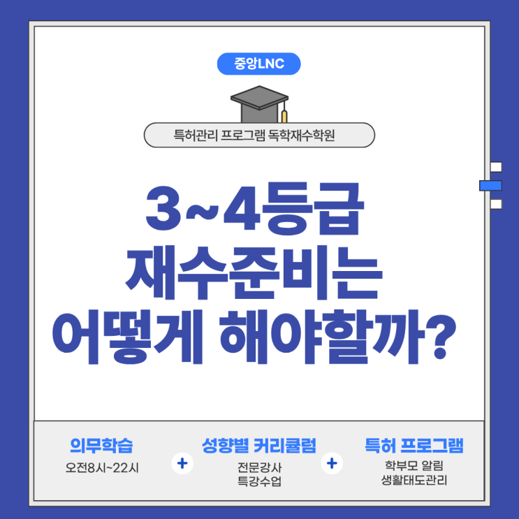 안녕하세요 인천 독학 재수학원 중앙LNC입니다 정시까지 슬슬 마무리 되면서 본격적으로 재수준비를 고민중이신 학생 분들이 많으실 것 같습니다 아마 기숙, 재수종합, 독학 중 어느 곳을 선택해야 할지 고민되실텐데 특히 3~4등급 대에 머물러 있는 중위권이라면 어떻게 준비해야 할지 간단하게 정리드리니 참고해보세요! 결론부터 말하자면, 상위권보다 오히려 중위권 학생일수록 학원 선택과 공부 방식이 훨씬 중요한데요 재수종합반 중위권에게 항상 맞는 선택일까? 재수종합반은 보통 상위반/하위반 클래스로 나뉘는 경우가 많은데요 문제는 3~4등급의 중위권 학생들은 대부분 하위반에 배정되는 구조로, 이때 흔히 생기는 상황이 있습....... <img src="https://blogthumb.pstatic.net/MjAyNjAyMDNfMTM4/MDAxNzcwMTEyODA3ODU4.qLbWsNMjqK6-dNzrnNyCDiG9R0kwWWbjwYb8e85szkcg.WzvB9GKqGNzBp7ll23vIX0eHBECqrwWdb2_gN030-xkg.PNG/%C1%A6%B8%F1%C0%BB_%C0%D4%B7%C2%C7%D8%C1%D6%BC%BC%BF%E4._%283%29.png?type=s3" />