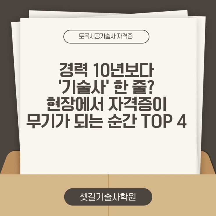 안녕하세요 셋길기술사학원입니다. 토목인들 사이에서 흔히 하는 고민이 있죠. "현장 짬밥(경력)이 최고지, 굳이 그 어려운 기술사를 따야 할까?" 하지만 막상 자격증을 손에 쥐면 세상이 달라 보인다고들 합니다. 오늘은 실무 경력만으로는 절대 넘을 수 없는, 토목시공기술사 자격증이 압도적인 무기가 되는 결정적 순간들을 짚어보겠습니다. 현장에서 발주처나 감리단과 기술적인 이견이 생겼을 때, 수많은 경력 증명보다 강력한 것은 보고서 하단에 찍힌 '기술사' 도장과 서명입니다. • 전문성 인정: 수십 페이지의 설명보다 기술사로서 제시하는 공법 비교안과 수치 기반의 의견서가 훨씬 더 높은 신뢰를 얻습니다. •....... <img src="https://blogthumb.pstatic.net/MjAyNjAyMDNfMjk2/MDAxNzcwMTA1ODg5MjE4.PKPzFYCaig-Qh3YChcLMQ_srKRKExPvZTZ3wPYa85b0g.EXvKGEAbgslhoMiNZqCN6Pmnu2x9vV-k2r_ReVwP8IEg.JPEG/%C1%A6%B8%F1%C0%BB%A3%AD%C0%D4%B7%C2%C7%D8%C1%D6%BC%BC%BF%E4%A3%DF%A3%AD001%A3%A8194%A3%A9.jpg?type=s3" />