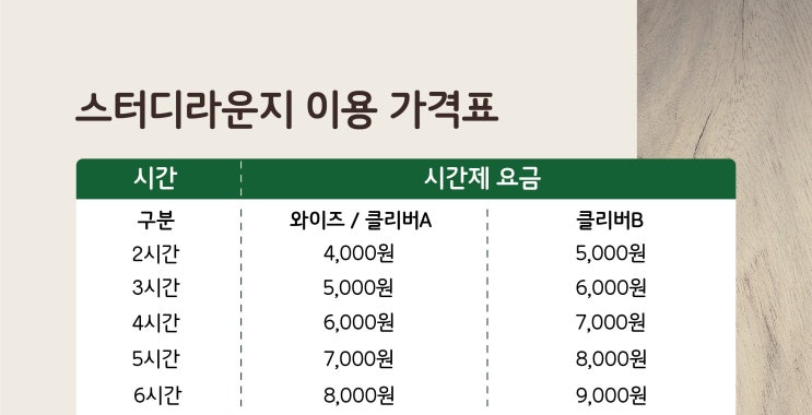 안녕하세요~! 와이즈입니다~*.* 오늘은 저희 와이즈 스터디 카페 시간권 소개와 이용 시 주의 사항에 대해 안내해 드리겠습니다. 당일 시간권 & 이용 시 주의 사항: ----당일 시간권---- 당일 시간권은 외출 시 시간이 차감됩니다. (외출 2시간이 지나면 자리 배석이 해제되오니 주의해 주세요~!) 2. 퇴실 시도 시간은 차감됩니다. 당일권은 당일 소진되는 상품이오니 이용할 시간만큼 결제해 주세요. 정액 시간권 & 이용 주의 사항: ------정액 시간권------ 30시간 정액권: 60,000 60시간 정액권: 90,000 100시간 정액권:140,000 입. 출입 시 꼭 지문인식기에 입. 출입 버튼을 눌러주세요. 2. 외출 시에도 시간은 차감됩니다. 3. 퇴실....... <img src="https://blogthumb.pstatic.net/MjAyNjA0MDNfNzgg/MDAxNzc1MTk1ODcxNDQ5.oCNvAVpglaoTXHgwTOuqT3_lmCRnFzNTBov3zAXTRHYg.P3IDXU7j7oWxCQRNjHy2JKYC8e-Wo7ul1f0ObqgqApEg.JPEG/%BF%CD%C0%CC%C1%EE%B7%EB%B0%A1%B0%DD.jpg?type=s3" />