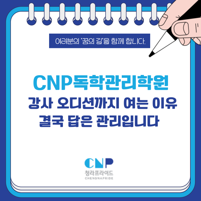 시대인재가 오디션까지 여는 이유 — 결국 답은 관리입니다 | 청라 CNP독학관리학원 최근 교육계에서 꽤 충격적인 일이 벌어지고 있습니다. 시대인재, 대성, 메가스터디, 러셀 같은 대형 프랜차이즈 수능 전문 학원들이 앞다퉈 ' 강사 서바이벌 오디션' 을 개최하고 있는 것입니다. 마치 슈퍼스타K처럼 강사들이 무대에서 실력을 겨루는 방식으로요. 실제로 시대인재는 2026년 2월 27일부터 4월 2일까지 이라는 이름의 강사 선발 오디션을 공식 개최했습니다. 총 상금만 무려 3억 원, 우승 상금은 2억 원에 달하는 압도적인 규모입니다. 모집 분야도 국어, 영어, 수학, 한국사, 통합사회, 통합과학, 대학별....... <img src="https://blogthumb.pstatic.net/MjAyNjA0MDNfOTIg/MDAxNzc1MTg3ODIxMjc3.rSzng-bRTXyg3lX_nQ3GfEAhscbbmaolZhCb1gIleRwg.6_AhkwIISNCij0ei-nnhWK_di3uCWnbXyiQ5CSEr6e0g.PNG/%C1%A6%B8%F1%C0%BB-%C0%D4%B7%C2%C7%D8%C1%D6%BC%BC%BF%E4__%BA%B9%BB%E7%BA%BB-_1_-001.png?type=s3" />