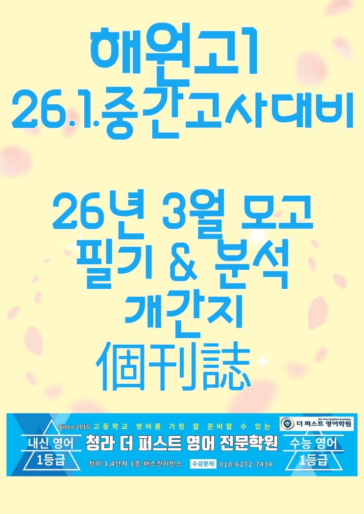 안녕하세요.^^ 청라 3,4단지 루비타워 (1층 배스킨라빈스) 7층 같은 자리에서 같은 사람이 10년째 수업하는 Since 2016 더 퍼스트 영어 전문학원입니다. 26년 1학기 중간고사 해원고등학교 초은고등학교 가정고등학교 신현고등학교 대인고등학교 시험 준비를 하는 중 해원고등학교 1학년 중간고사 대비 집 제2권 26년 3월 모의고사 범위를 제작하였습니다. 더욱 성심성의껏 지도하겠습니다. #청라고 #초은고 #해원고 #청라고등학교 #초은고등학교 #해원고등학교 #청라고영어 #청라고영어학원 #해원고영어 #해원고영어학원 #초은고영어 #초은고영어학원 #청람중영어 #청람중영어학원 #청호중영어 #청호중영어학원 #해원중영어 #해원중영어학원 #예....... <img src="https://blogthumb.pstatic.net/MjAyNjAzMjhfNyAg/MDAxNzc0NjkzNTc4NjY3.YJ7ZRTvyHM54hU3zpPGupTvFkS8pC46XGUUuIC231Fsg.15WOG6DIWmcAuR45HrvJ_Dyv1_fqp-uCawpzvfQTkfsg.JPEG/%C1%A6%B8%F1%C0%BB_%C0%D4%B7%C2%C7%D8%C1%D6%BC%BC%BF%E4_%2818%29.jpg?type=s3" />