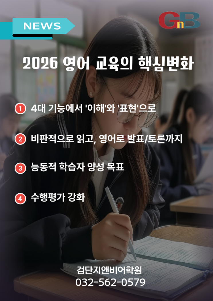 2026년 교육과정 변화 어떤 변화들이 있을까요? 1. 듣기·읽기"에서 "보기(Viewing)"로의 확장 단순히 텍스트를 읽는 것을 넘어 동영상·도표·이미지 등 디지털 매체 속에 담긴 영어 정보를 분석하고 이해하는 능력을 평가합니다. 아이가 유튜브 키즈나 교육용 영상을 볼 때, "방금 영상에서 주인공이 왜 저런 표정을 지었을까?" " 어떤 내용이 기억에 남아? "같은 질문을 통해 시각적 문해력을 길러주는 것이 중요합니다. 꾸준함이 이깁니다! 검단지앤비어학원 교육문의: 032-562-0579 . . #검단영어 #마전동영어 #검단지앤비 #검단gnb #검단맘 #검단중 #마전중 #불로중 #영어공부 #영어습관 #영어말하기 #지....... <img src="https://blogthumb.pstatic.net/MjAyNjAzMjNfMTE1/MDAxNzc0MjQ5OTk2NzM3.-JmB_QIZguRH_OXf4R2M-NFerKGe0PB9zeTT3Z-X4isg.YpeRfcht4t2AVacVilMEahzoJwy6vdEaxbz6cSzWvcUg.PNG/1.png?type=s3" />
