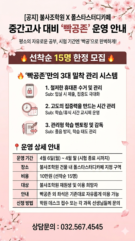 안녕하세요 중고등입시학원 불사조학원입니다! 이번 1학기 중간고사를 대비하여 '빡공존' 운영을 준비했요! 빡센 관리로 핸드폰은 잠시 안녕! 공부에만 집중 할 시간! 이번 중간고사 준비, 불사조에서 완벽하게 끝내봐요! #가좌동학원 #가좌고입시학원 #가좌동입시학원 #서구입시학원 #가좌동중등학원 #가림고학원 #가좌고학원 #가좌동중등학원 #가좌동중등영어 #가좌동중등수학 #가좌동국어 #가좌동고등국어 #가좌동고등수학 #가림고 #가좌고 <img src="https://blogthumb.pstatic.net/MjAyNjAzMjdfMjMw/MDAxNzc0NTg5OTg1MjMz.0DCy-M0rCBHADh5_e-o28H4Sm-2Iqin6ETOn4sBbraUg.OEqLdSXyO_CXt5ZhEyItryDg1cWZ6h6ndlwLuZjGYfcg.PNG/KakaoTalk_20260327_135128099.png?type=s3" />