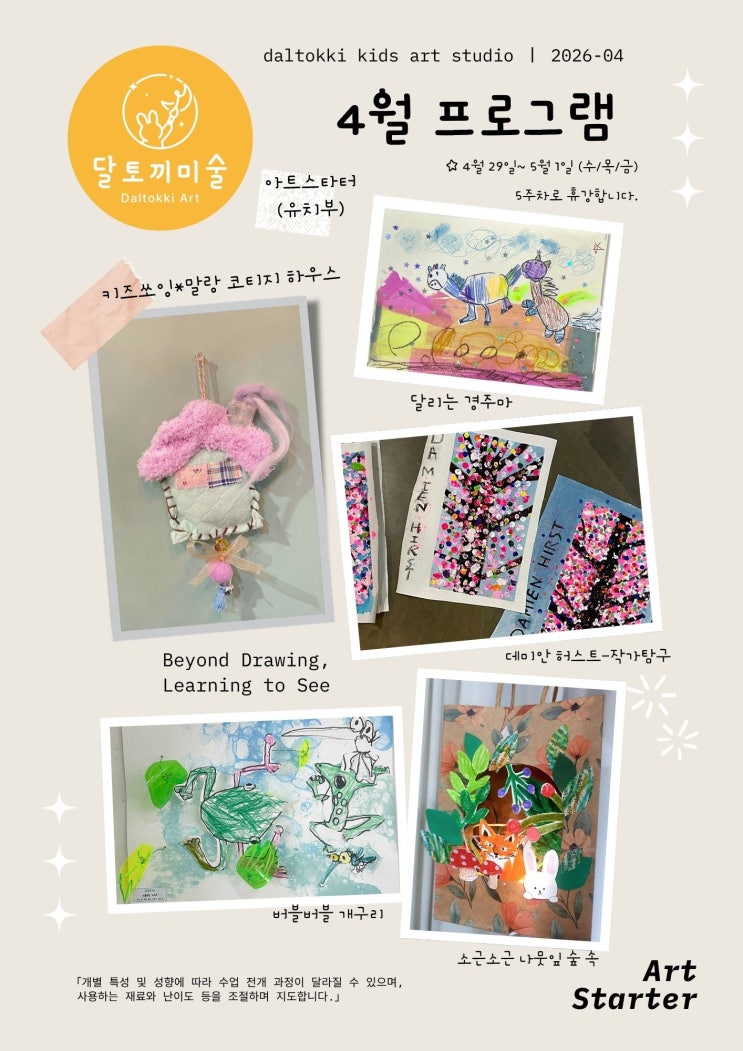 학부모님, 안녕하세요 봄의 설렘이 가득한 4월, 달토끼미술 수업 프로그램 안내드립니다. 이번 달은 아이들의 흥미와 집중도가 높은 바느질 수업과 다양한 주제의 회화 수업으로 구성하여, 자연스럽게 표현력과 안목을 키울 수 있는 깊이 있는 수업들로 진행됩니다 아트 스타터 - 유치부 프로그램 5세~7세 / 유치부는 2022년생부터 수업참여 가능합니다. 유치부 체험수업가능 (체험비-만원) - 등록하면 체험수업비 무료! 아트 레귤러 - 초등 프로그램 중등부는 비슷한 주제에서 작품의 퀄리티를 높여 진행됩니다. 4월 29일 ~ 5월 1일 (수/목/금) 학원 휴강 → 5주차로 휴강입니다. 디지털 드로잉 토요반 개설....... <img src="https://blogthumb.pstatic.net/MjAyNjAzMjlfMjQx/MDAxNzc0NzY4MDczNTI3.ccu92n48KOqs2zPuiAdIcE-libob3hGgzW1ljwO7omog.2W0uziaR27m2IyInmURpBnO0q2EKm-Q2Tn9d9S5HXW8g.JPEG/2026_04_%C0%AF%BE%C6.jpg?type=s3" />