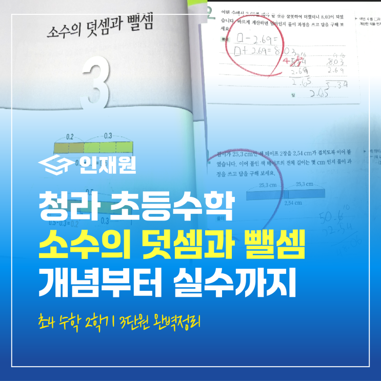 초등 4학년 2학기 수학 -3단원: 소수의 덧셈과 뺄셈 수업 안내 안녕하세요 청라 초등 수학 인재원 수학전문학원입니다 이번에 소개하는 수업은 소수의 덧셈과 뺄셈단원입니다. 이번 수업에서 배우는 핵심 내용 아이들은 이번 단원을 통해 소수의 개념과 자릿값(0.1, 0.01 등)에 대한 이해를 확장하고 소수 두 자리 수까지의 덧셈과 뺄셈 계산 방법을 익히며 자연수와 소수, 소수와 소수의 다양한 계산을 연습하게 됩니다. 특히 단순 계산이 아니라 자릿값의 원리를 이해하고 계산하는 힘을 기르는 데 집중하고 있습니다. 왜 이 수업이 중요한가요? 소수는 아이들이 일상생활에서 가장 자주 접하는 수입니다. 예를 들어 돈(1.5천원), 길이(1.2km),....... <img src="https://blogthumb.pstatic.net/MjAyNjAzMzBfOTIg/MDAxNzc0ODU1NTM0NTkw.paCy-UUVP7xZ-PKw8Sn-KXQ01Axw5G3olKJQ8eVDQIAg.5tHQzDXWlqNwnv5QJmyyPsTp_HwMr2J7CPP-wyXz8mcg.PNG/%B4%EB%C1%F6_8.png?type=s3" />