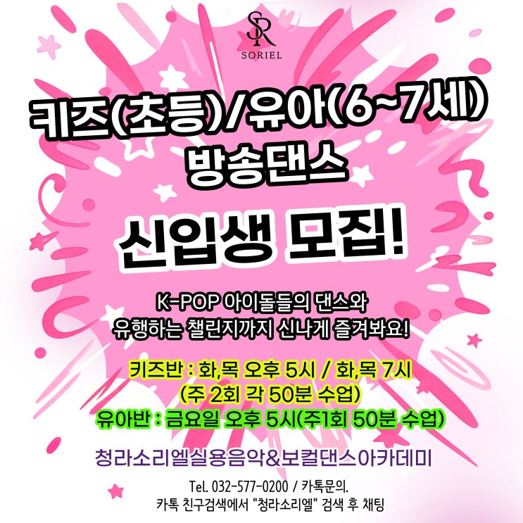 안녕하세요, 인천서구청라가정방송댄스학원 소리엘입니다~ 이번에 K-POP방송댄스 키즈반과 유아반(6~7세) 신입생 모집을 모집하고 있어요~^^ 아시는 분들도 많으시겠지만 인천서구, 청라, 가정동쪽에 6세~7세 아이들을 위한 방송댄스반은 거의 전무한데요, 소리엘에서는 유아 친구들도 매우 신나게 댄스를 배우고 있다는 사실! < 유아반 > 아이들이 신나게 춤추고 있는 모습을 보면 저도 모르게 미소가 지어진답니다~ 전세계적인 K-POP 열풍으로 인해 댄스를 좋아하는 아이들이 참 많아졌는데요, 댄스는 아이들 건강뿐만아니라 신체활동을 통해서 뇌에 긍정적인 자극을 주고 창의성을 높여준다고 합니다! 어린 시절부터 춤도 추고 아이돌들....... <img src="https://blogthumb.pstatic.net/MjAyNjAzMzFfNDUg/MDAxNzc0OTQyMjMwMTg5.WhnCLC04-6zU2Qyp0RcIMYP3d6LD0mZHukTjP2IoNJkg.CcaeFYuJim-UVtTOx_vSIhdY037b1dBvJBT8KD4yMQcg.JPEG/26%B3%E2%C5%B0%C1%EE_%C0%AF%BE%C6%B9%DD%BD%C5%C0%D4%BB%FD%B8%F0%C1%FD.jpg?type=s3" />