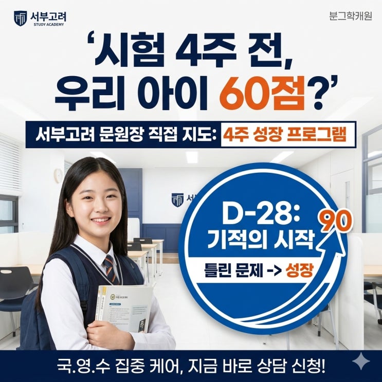 "우리 아이는 성실한데 왜 시험만 보면 점수가 그대로일까요?" 상담실에서 제가 가장 많이 듣는, 그리고 가장 안타까운 질문입니다 . 열심히는 하지만 '기억'과 '이해'가 연결되지 않는 공부, 이제는 끊어내야 합니다. [상담 신청] 우리 아이 60점대 탈출 전략 바로 문의하기 https://blog.naver.com/watchofkant 01094320360) 1️⃣ 공부의 판을 바꾸는 서부고려 '4주 성장 프로그램' 1주차: "원장님, 이제 글이 읽혀요!" (구조화 읽기) 무작정 읽는 것이 아니라 대단원부터 소단원까지 의미 단위로 쪼개 핵심을 찾는 훈련을 합니다. 아이가 "나도 하면 되는구나"라는 자기 효능감....... <img src="https://blogthumb.pstatic.net/MjAyNjA0MDFfMjky/MDAxNzc1MDQxODg4OTA2.Nqx9KcIUJula-0t9fntJ6UkNTCvUH4cuh2AB5rCCoQYg.zOQdQ83NRhBbs-rKipwbS7KgwZd-7dedi2m885KOhQAg.JPEG/KakaoTalk_20260401_195050428_02_%281%29.jpg?type=s3" />