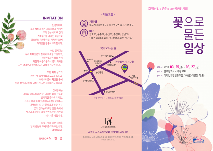 안녕하세요, 광주 플로리스트 학원 국비지원 꽃 학원이자 플라워샵 디자인휴먼 입니다! 오늘은 광주광역시 서구청 로비 에서 이번 주 '수, 목, 금' 진행하는 공공전시회 소개를 해드리려고 왔습니다! #광주가볼만한곳 #광주이번주뭐하지 #광주공공전시회 #광주서구청전시 #광주서구뭐하지 #광주서구볼거리 #화훼전시회 #디자인화환 #신화환 #화환전시 화훼 산업 증진을 위한 공공전시회 주제는 꽃으로 물든 일상 입니다. 일시 - 2026.03.25(수) ~ 2026.03.27(금) 장소 - 광주광역시 서구청 로비 주최 - 디자인휴먼협동조합 / 화 애 락 디자인휴먼 대장이신 노민영 전시총감독님과 20명의 플로리스트 참여 작가님을 모시고 공공전시회가....... <img src="https://blogthumb.pstatic.net/MjAyNjAzMjNfMTIg/MDAxNzc0MjMxMzI2NTM5.-_Rz3YaoiTw5kRwcsNKhuE90I3yvLCyMfp-6m4SWRZkg.E9ncH47UeieUsBXpeRbOwkc-kbUuwWRWbt0mklVw-9kg.PNG/KakaoTalk_20260323_105724546.png?type=s3" />
