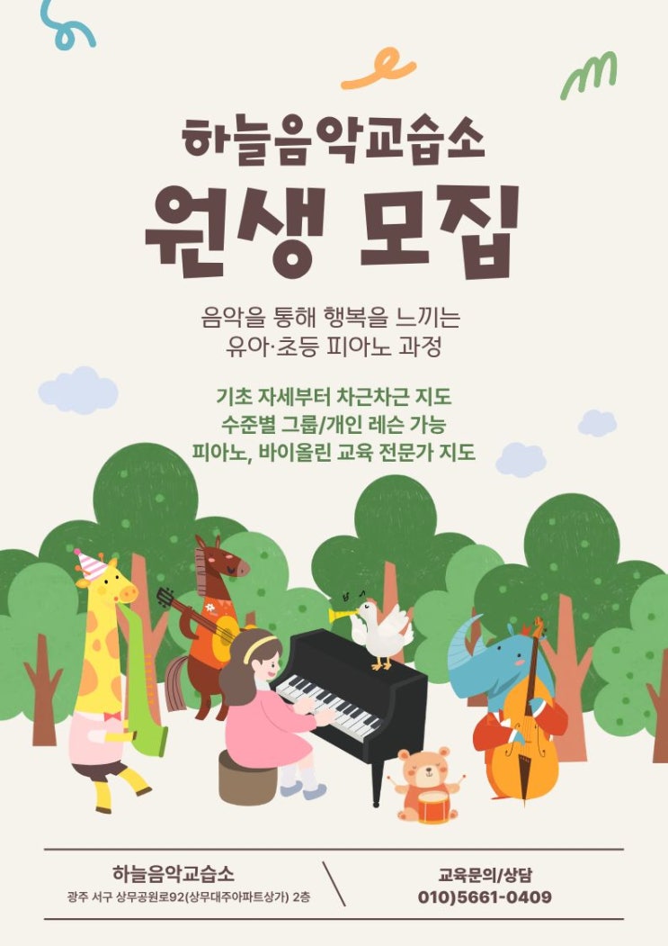 광주 치평동 피아노학원, 우리아이 첫 피아노 고민이라면? 전문적인 음악교육 하늘음악교습소 / 타임정원제, 원장직강