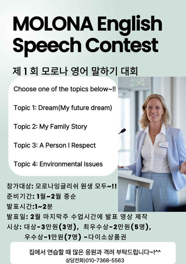 제1회 모로나 영어 스피치대회 안내 안녕하세요, 모로나잉글리쉬입니다 아이들이 영어로 자신의 생각을 표현하고, 자신감을 키울 수 있는 특별한 시간이 찾아왔어요! 모로나잉글리쉬에서 처음으로 영어 스피치대회를 개최합니다 그동안 배운 영어를 바탕으로 짧지만 의미 있는 영어 발표에 도전해 보려고합니다! ⸻ 대회명 제1회 모로나 영어 말하기 대회 (MOLONA English Speech Contest) ⸻ 참가 대상 모로나잉글리쉬 원생 누구나 참여 가능! ⸻ 발표 주제 (아래 중 1가지 선택) 1️⃣ Dream (My Future Dream) 2️⃣ My Family Story 3️⃣ A Person I Respect 4️⃣ Environmental Issues 아이들의 수....... <img src="https://blogthumb.pstatic.net/MjAyNjAxMTJfMTM0/MDAxNzY4MTk1MDc4Mzc0.x4Vx3ArfJmcanTmatiN3BCZOEhV5Bnonar7gw0lEEHYg.qpGfMfjH8bijyLWubleKEQt2s_51f9YMyvmefQaAtEYg.JPEG/26%B3%E2%BF%B5%BE%EE%B8%BB%C7%CF%B1%E2%B4%EB%C8%B8.jpg?type=s3" />