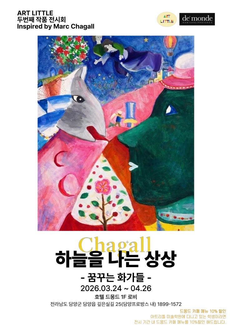안녕하세요 아트리뜰 미술학원입니다 ! 저희 미술학원아이들과 첫 전시를 한지가 약 일년여가 지나었네요 이번에 두번째 전시회를 열게 되어 !!! 부푼 마음을 가지고 포스팅을 작성하러 왔답니다 요번 작품전 이름은 하늘을 나는 상상 ! - 꿈꾸는 화가들 - 입니다 이번 겨울 방학때 저희 아이들에게 커다란 캔버스에 그림을 완성해보는 경험을 선사해주고싶어서 10호 크기의 캔버스에 작품을 진행하였는데요 , 샤갈 작가수업을 진행하며.... 저희도 초현실주의 작가가 되어보며.... 작품을 완성하였는데 어머 ㅠㅠ 정말 그림이 너무 예쁜거에요... 이건 진짜 전시해야해 ㅠㅠ!!! 하는 맘으로 급작스럽고 열심히 준비했답니다 사실적이지 않은 몽....... <img src="https://blogthumb.pstatic.net/MjAyNjAzMjBfMTE5/MDAxNzc0MDA2MjUzMjkw.0ZB_SFNEaoVP8M9PkwnR3mmjfc8WFY3ombpcJvdwbB8g.AOKewiNviGMG4pgthNIwOG-eUbT_NUtcY6r0K2b4e2Yg.JPEG/%C1%A6%B8%F1%C0%BB-%C0%D4%B7%C2%C7%D8%C1%D6%BC%BC%BF%E4_-001_%2821%29.jpg?type=s3" />