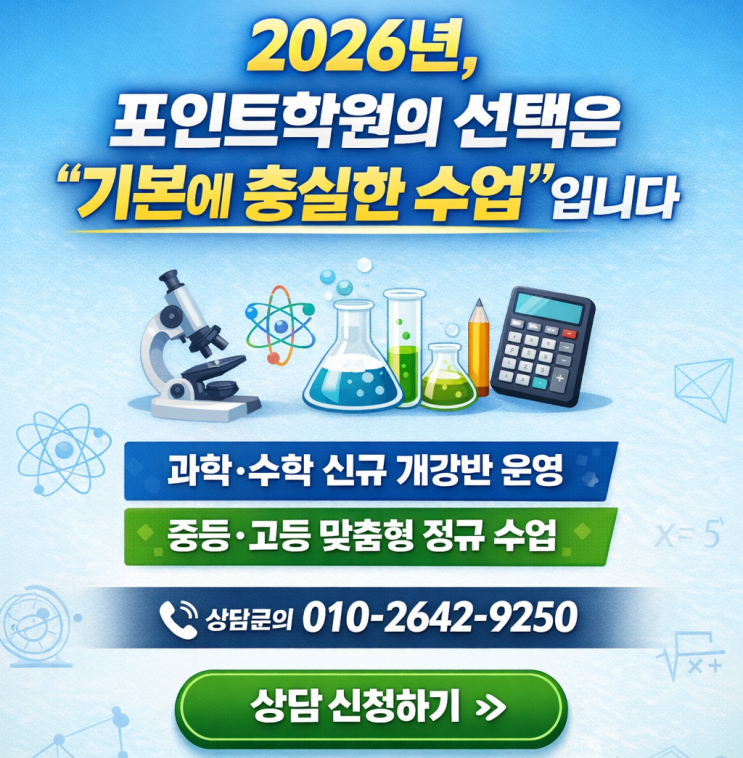 일곡동과학학원 포인트학원 2026년 과학·수학 신규 개강반 운영 안내 광주북구과학학원 안녕하세요. 일곡동과학학원 포인트학원입니다. 포인트학원은 학생 한 명, 한 명의 학습 흐름과 누적 이해도를 가장 중요하게 생각하며 단기 성과보다 지속 가능한 실력 완성을 목표로 수업을 운영하고 있습니다. 2026년을 마주하며 학부모님들께서 가장 많이 문의 주시는 과학·수학 특강 운영 여부 중·고등 신규 개강반 구성 에 대해 정리해 안내드립니다. 과학 수업 운영 안내 일곡동과학학원·광주북구과학학원 2026년 과학 수업은 단기 특강 없이 정규 수업 중심의 신규 개강반으로 운영됩니다. 단기간 점수 올리기식 특강이 아닌 기본기·개념 누적형 커....... <img src="https://blogthumb.pstatic.net/MjAyNjAxMDdfMjk0/MDAxNzY3NzY2NDY4MDk4.YffkWcnUO--A6WNmj18ilgcfq944PDKAKZkrQRA0d9wg.4mNq_Sn3JCNvd6Sqh_yVBqj_5OWxBLmq2dC638rFjIEg.PNG/ChatGPT_Image_2026%B3%E2_1%BF%F9_7%C0%CF_%BF%C0%C8%C4_02_54_11.png?type=s3" />