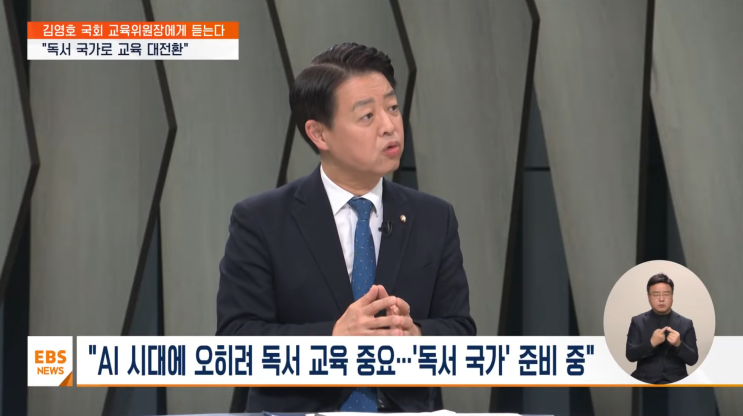 안녕하세요 광주 독서논술맛집 '리드인 광주지사 직영점'입니다. 오늘은 대한민국 교육에 있어서 중요한 변환점이 될 수 있는 일이 있어 글을 올립니다. 오는 1월 23일, 국회 교육위원회를 중심으로 '독서 국가 출범식'이 열릴 예정입니다. 이는 단순한 행사가 아니라, 대한민국의 교육 패러다임을 근본적으로 바꾸려는 거대한 비전의 시작입니다. 지난해, 11월 26일 김영호 교육 위원장이 EBS 뉴스에 출연해서 인터뷰를 진행했었는데요 많이 강조하셨던 부분이 ' AI 시대 독서의 중요성'과, 현재 준비 중인 '독서 국가' 대한 비전과, 로드맵에 대해 말씀하셨습니다. 왜 지금 '독서 국가'인가....... <img src="https://blogthumb.pstatic.net/MjAyNjAxMTJfOTQg/MDAxNzY4MTk3MjkxMjIw.k4MZhp_7WyPlNRfAai_j2x5WyuzwGBis_JQVYV8gWxMg.pbP4EcY1nz3uIpBdORG1O7htxOX1AAMdzOnwEqUSPkMg.PNG/%B1%E8%BF%B5%C8%A3_%C0%CE%C5%CD%BA%E42.png?type=s3" />