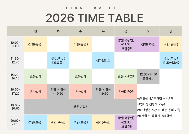 안녕하세요. 퍼스트발레 아카데미 운영실장 정민주입니다. 언제나 사랑이 넘치는 퍼스트발레. 올해도 어김없이 열발하는 한해가 되도록 하겠습니다. 간단한 공지나, 특강은 인스타그램에 수시로 업데이트 되고 있어요! 현재 유아발레 수업은 월요일 정원이 마감되었습니다. 월요일 대기등록 부탁드립니다. (수, 금요일 등록 가능) 성인작품반 2026-1기는 수강 종료되었습니다. 2026-2기 새로운 작품으로 공지 올려드리겠습니다^^ (요일, 시간 변동가능성 있음) 따뜻한 봄이 한 발 더 가까이 다가왔는데요, 선 발레 후 꽃구경, 추천드리며,, ෆ 현재 진행중인 시간표 공유드립니다^^. 궁금하신 사항 언제든 문의 남겨주세요. 감사합니다^^ 062.528....... <img src="https://blogthumb.pstatic.net/MjAyNjAzMjRfMTEz/MDAxNzc0MzM0MTUzMzgz.9CiW-QLSL26dWVfJu643_YSulmCa6dx1ZapCq4m8uZMg.M6ZBF8CLgdHeVz8BMsoi8prqPQO_8DdSlog397kNafsg.PNG/%C1%A6%B8%F1%C0%BB_%C0%D4%B7%C2%C7%D8%C1%D6%BC%BC%BF%E4._%281%29.png?type=s3" />