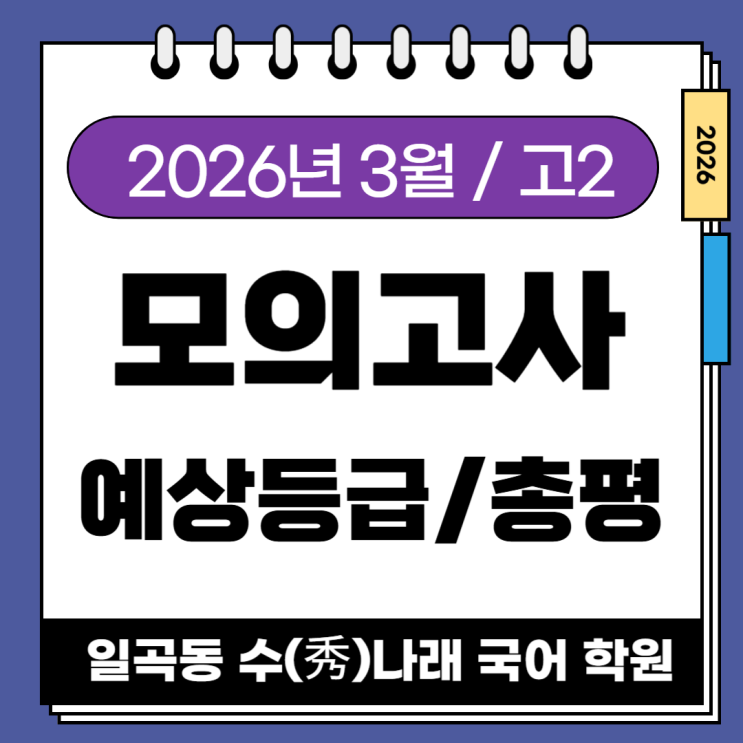 안녕하세요~ 일곡동 국어 학원 수(秀)나래입니다. 바로 어제(24일/화) 서울시 교육청에서 주관한 올해 첫 '전국연합학력평가'가 끝났습니다. 전국연합학력평가'는 수능과 가장 유사한 형태로 전국 학생들을 대상으로 시행되는 만큼 현재 자신의 위치를 가늠할 수 있는 가장 객관적인 척도가 됩니다. 특히나 3월 학력평가는 현재의 역량 확인은 물론 향후 학습 계획을 세우고 부족한 부분들을 보완해 갈 수 있는 좋은 자료로서의 기능을 할 수 있다는 점에서 꽤나 중요하다고 볼 수 있습니다. 그런 답부터 확인하고 가겠습니다. <고2 3월 모의고사 정답표> <고2 예상 등급컷> 아래는 예상 등급컷으로 혼동 없으시길 바....... <img src="https://blogthumb.pstatic.net/MjAyNjAzMjVfMjE2/MDAxNzc0NDE4NDc4NTI0.2Uq0SLOSJMullsQJdIiTR_FJ3aKku2Sl4YMxeMHShCUg.DSJYCH_QEd7FGUSaI0KwyIBmER-iAF2qbXBMjOgiurYg.PNG/%C1%A6%B8%F1%C0%BB_%C0%D4%B7%C2%C7%D8%C1%D6%BC%BC%BF%E4_-001_%28600%29.png?type=s3" />