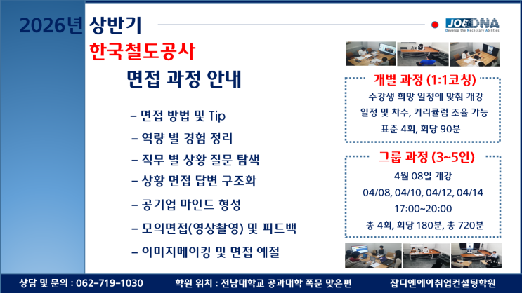 안녕하십니까? 잡디엔에이 취업컨설팅학원입니다. 2026년 상반기 한국철도공사 면접과정을 다음과 같이 안내해 드립니다. 한국철도공사(코레일) 면접과정은 1:1개별과정과 그룹과정으로 진행됩니다. 1:1개별과정은 수강생 1인과 일대일과 코칭하는 과정입니다. 그룹과정은 수강생 3인~5인을 그룹으로 코칭하는 과정입니다 1:1개별과정은 회차나 커리큘럼, 코칭일정에 대한 조율이 가능하며, 보통 4회로 진행하는 수강생이 가장 많습니다. 가능한 수강생이 희망하는 일정에 맞춰 진행해 드리기 위해 노력합니다. 면접을 처음 준비하시거나 심층적으로 코칭받고자 하는 수강생분들에게 추천드립니다. 수강료는 진행하는 회차별로 상이하며, 4회차 진....... <img src="https://blogthumb.pstatic.net/MjAyNjAzMjRfMjY2/MDAxNzc0MzQ2MzYxNTM4.ZgtYhlvrKPLQhOXBrtvv0zYTeEGDfKHpTsZKotzQ9EIg.9d3QFuIMuM5cIgeUdhevNDCPiyPgfWQgoCBiiMvE_zwg.PNG/2026상_코레일.png?type=s3" />