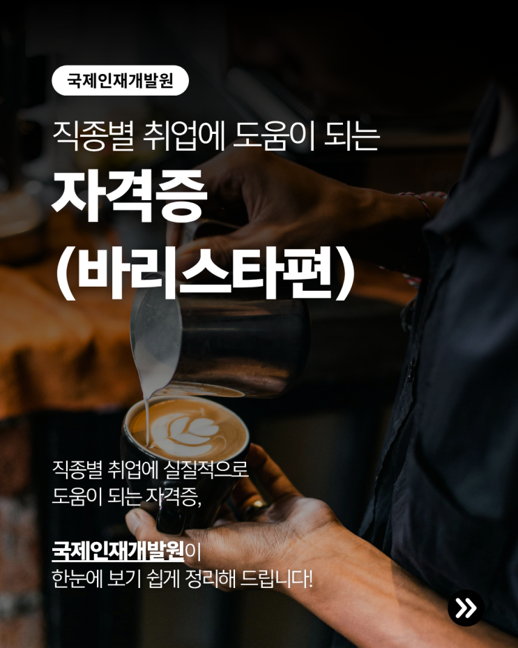 살랑이는 봄바람에 커피 향이 더욱 짙게 느껴지는 오늘, 우리 국제인재개발원의 블로그를 찾아주신 여러분을 진심으로 환영하고 축복합니다! 진정한 커피 전문가를 꿈꾸는 분들이라면 어떤 자격증이 나를 더 빛나게 해줄까? 고민이 많으실 텐데요. 오늘은 기초부터 심화 기술까지, 바리스타로서의 몸값을 높여줄 핵심 자격증 4종을 자세히 정리해 보았습니다! 최근 카페 취업이나 창업을 준비하시는 분들이 늘어나면서 이 두 자격증은 환상의 짝꿍으로 불리고 있어요. 1. 바리스타 1급 • 2급 에스프레소 추출, 우유 스티밍, 머신 관리 등 카페 운영의 가장 기초적이면서도 필수적인 실무 능력을 평가하는 자격증입니다. 국내에서 가장 대중....... <img src="https://blogthumb.pstatic.net/MjAyNjAzMjdfMTg3/MDAxNzc0NTg5NjY2MzU1.Vn4yWEx83yevzzgvEz8NpxIaNheWe4-mJYtjJDV6Z_gg.Cz9GslnzTabQuDITLRAwgieGVhpGsDVz5Ivy9QYIzCgg.PNG/1.png?type=s3" />