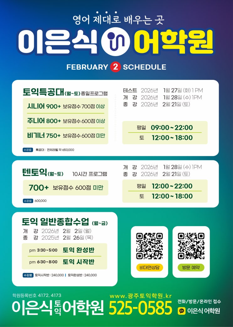 안녕하세요! ^^ 지난 2025년, 잘 보내 주셨나요? 그러고 보면 시간은 우리가 무얼 하고 있지 않아도 혹은 몰입하여 열심히 무언가를 이루어내도 모두에게 공평하게 똑같은 속도로 흐르죠 특히나 지금은 아무것도 하고 있지 않아도 시간도둑이 너무 많잖아요.. 이미 지나간 시간은 어쩔 수 없고 새로 만난 2026년, (시간 도둑 잡고..) 시간에 끌려가지 말고 시간보다 앞서 가는 여러분 되시기를! 그럼, 2026년에 토익점수 "복" 많~~~~이 받으세요 ^^ 2월 개강일정입니다~ 종일 프로그램 - 1개월 과정 10시간 프로그램 - 1개월 과정 일반종합수업 - 2개월 과정 이렇게 3가지 과정이 있어요 [종일프로그램 - 토익특공대 시니어,주니어,비....... <img src="https://blogthumb.pstatic.net/MjAyNjAxMTRfMTc2/MDAxNzY4MzkwNzI0OTQ2.dnwlamGdIqn9ORsqY6iIuBMw6BNSLbJ5KTCUKPkIpuIg.fU9Rw6J1i63ptGEYnLskTk6eNcbwribCNlzLx8qgXMgg.JPEG/2602.jpg?type=s3" />