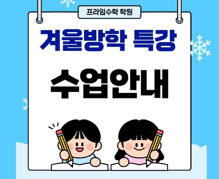 프라임수학학원 겨울방학 특강 수업 안내 ❄️ 겨울방학은 한 학기를 정리하고 다음 학기를 준비하기에 가장 좋은 시기입니다 ☃️ 프라임수학학원에서는 이 중요한 시간을 알차게 활용할 수 있도록 겨울방학 특강 수업을 진행합니다 ✍️ 이번 겨울방학 특강은 기초부터 심화, 그리고 선행학습까지 학생의 수준에 맞춰 단계적으로 구성되어 있습니다 먼저 기초 잡아주기 수업을 통해 그동안 놓치기 쉬웠던 개념과 연산을 다시 점검하고 수학의 기본 구조를 탄탄하게 다집니다 기초가 흔들리는 학생들도 부담 없이 따라올 수 있도록 차근차근 진행됩니다 이후에는 심화학습 수업으로 응용 문제와 사고력 문제를 통해 문제를 바....... <img src="https://blogthumb.pstatic.net/MjAyNjAxMTRfMTk3/MDAxNzY4MzYwMjg3NDY5.ktoI_-HtLqlHBH4S9JZZJ3cjab8sCXHIdEPIUHIPLIcg.xbnyButavwGHI0G6ud43y9XYw60zPuxbhPY2ZG7Rggwg.JPEG/%C1%A6%B8%F1%C0%BB_%C0%D4%B7%C2%C7%D8%C1%D6%BC%BC%BF%E4..jpg?type=s3" />