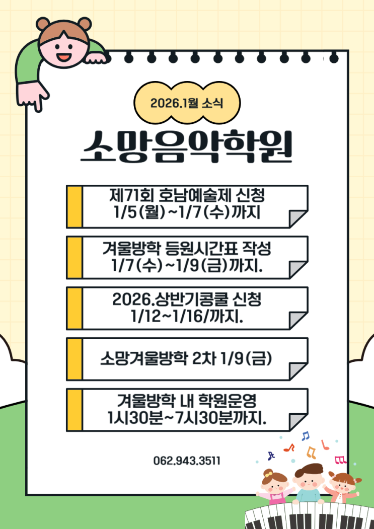 겨울방학 준비중! 그 시작은 등원시간표 짜기입니다 소망 학부모님들의 전적인 도움과 협조로 소망음악학원은 시간정원제 수업을 3년째 지켜 갈 수 있게 되었습니다. 진심으로 감사드립니다❣️ 이번 겨울방학에도 조금 번거로우실지라도 등원시간표를 작성하여 보내주세요 더욱 밀도있고 꼼꼼한 레슨으로 보답드릴것을 약속드립니다! 소망쌤 드림- <img src="https://blogthumb.pstatic.net/MjAyNjAxMDdfMTA2/MDAxNzY3NzExOTA3NjM0.u8dG64G0_vsVg0-kiRbbFPiP6KW_wXyFFCM-5-xl7uMg.WWLdvpqNOA6VbAUX757kYCZ9eEkrcr0fuVc7_oRReBIg.PNG/1767418120163.png?type=s3" />