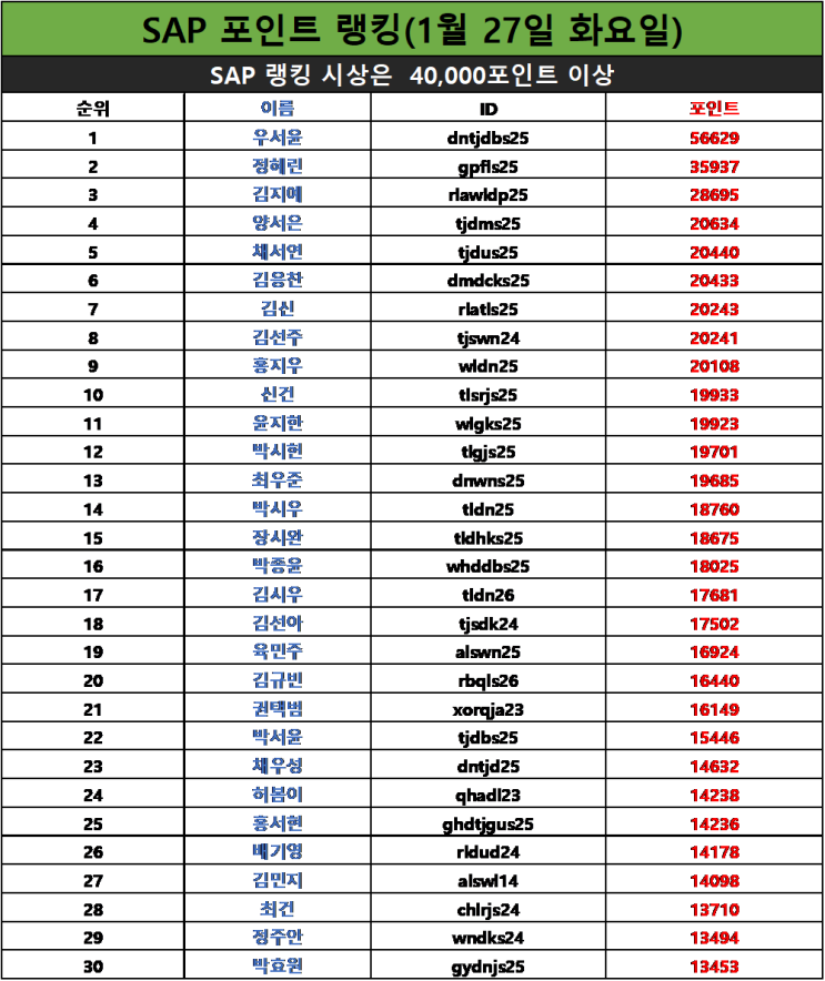 안녕하세요, 더클래스어학원입니다. 2025년 01월 27일 기준 SAP 포인트 랭킹 순위표입니다. <img src="https://blogthumb.pstatic.net/MjAyNjAxMjdfMTU0/MDAxNzY5NDkzNTM3MDA3.MtNLnrligGcvuPzM5tabzVerqrWN2eK4vgZPnowJLREg.ZNxvREUl1t0hfA1iEsf1OnKfpKhPedy_fm-YEwc2SgUg.PNG/image.png?type=s3" />