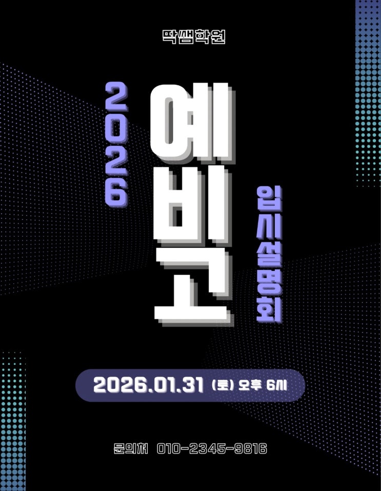 딱쌤학원 예비고 1학년 입시 설명회 안녕하세요. 딱쌤학원 원장 김근범입니다. 26년도 고등학교 신입생 학부모님을 위한 예비고 입시 설명회가 다음과 같이 예정되어 있습니다. 일시 : 26년 1월 31일 토요일 6시 장소 : 딱쌤학원 (인원초과 될 경우 변경될 수 있습니다) 문의 : 010-2345-9816 <img src="https://blogthumb.pstatic.net/MjAyNjAxMjdfMjk2/MDAxNzY5NDkyMzg1NjYz.U2G-vzA0qmSnLilk_s730SP6-310SuYHN7FYCfS8XBsg.G7ljxDfIeVKT_fE2vLJh4bl9Ftpg8BDZpOjsna6qi_cg.JPEG/KakaoTalk_20260127_143710872.jpg?type=s3" />