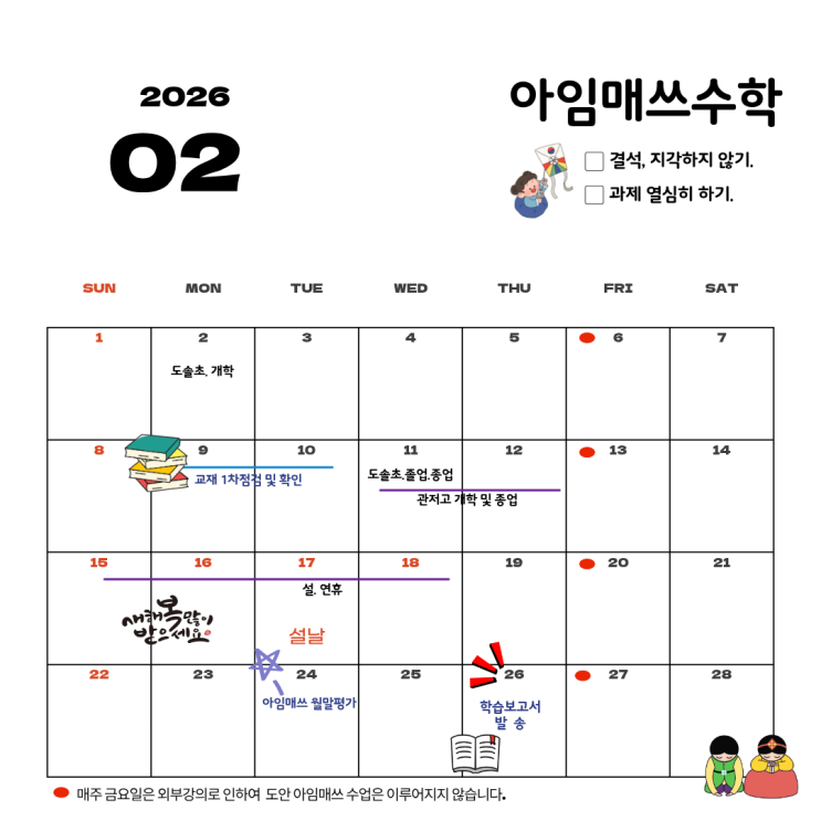 안녕하세요. 아임매쓰수학입니다. 학습의 흐름을 지키는 2월, 새 학기를 준비하는 2월입니다. 방학 후반부는 학습 리듬이 느슨해지기 쉬운 시기이지만, 동시에 새 학기를 준비하는 가장 중요한 시간이기도 합니다. 지금의 학습 태도와 마무리가 1학기 성적과 학습 자신감으로 자연스럽게 이어지게 됩니다. ■ 2월 학원 운영 일정 안내 ●2월16일(월)~2월18일(수) : 설연휴 (휴원) ●2월19일(목) : 정상수업 진행 ●2월24일(화) :2월말평가 ●2월26일(목) : 교재 및 학습보고서 발송 ●2월26일(목) : 특강 수여식 및 시상 2월에는 정상 수업 및 학년별 학습 계획에 맞춘 수업이 진행됩니다. 방학 중 선행 학습을 정리하고, 학기 중 내용을 안정적....... <img src="https://blogthumb.pstatic.net/MjAyNjAxMjlfMTYw/MDAxNzY5Njg1MTQ5NjQ5.uzpFGhanftppd4bSwcAWXdP9U3XX-u3-vG1HYFH3X2Ig.83fOUAvLO4J08W7MKkPAhE23WGeXAPJa3GkLc1uYMNQg.PNG/26-2%BF%F9.png?type=s3" />