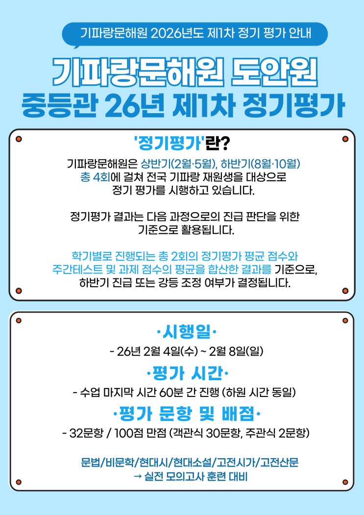 안녕하세요 :) 기파랑 문해원 중등관 입니다. 오늘은 기파랑문해원에서 시행되는 정기평가에 대해서 안내드리려고 합니다. 기파랑문해원의 정기평가는 단순히 점수를 확인하기 위한 시험이 아니라, 학생 개개인의 학습 이해도와 누적 학습 상태를 점검하고 다음 학습 단계로 나아가기 위한 기준을 마련하는 과정입니다. 기파랑문해원은 상반기(2월·5월), 하반기(8월·10월)로 나누어 연간 총 4회, 전국 기파랑문해원 재원생을 대상으로 정기평가를 시행하고 있습니다. 기파랑문해원에서는 정기평가 결과를 바탕으로 승급·강급·탈락 제도를 운영하고 있습니다. 평가 결과는 학기별 정기평가 2회 평균 점수와, 주간 테스트 및 과제 점수를 종합하여....... <img src="https://blogthumb.pstatic.net/MjAyNjAxMzFfODkg/MDAxNzY5ODU0OTYwNjAw.QcQh3OWsW8-RZg0AulOpjAO3dg7jpFNvjJjuJ5EzfBsg.h_dBapopNf5v8vIZm1-mLvfhV7u00RymnRc9qG5SyAMg.JPEG/%C1%A4%B1%E2%C6%F2%B0%A1.jpg?type=s3" />