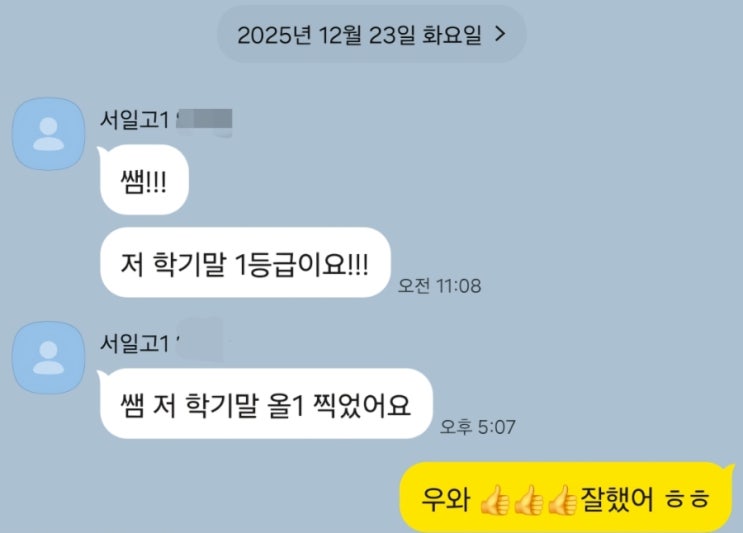 서일고 1학년 2학기 기말 결과입니다. 2학기 최종 1등급을 받았네요❤️ 더불어 전과목 올 1등급을 석권한 친구입니다 ㅎㅎ 이 외에도 전원 2등급 이상을 달성하였으며 제세현국어에 온 뒤로 비약적인 등수 상승을 보여준 학생도 있습니다. 2학년때는 모두 1등급을 받을 수 있도록 최선을 다하겠습니다 <img src="https://blogthumb.pstatic.net/MjAyNTEyMjNfMTIy/MDAxNzY2NDgwNjU5ODY0.LA8FeHX6ckILnRQksHI5O9-qH4fckwwflJAEbOWrhFQg.JMipJMXcyJSI_6R4zjubmQovLoqdqff7nTKqbZfKr8Mg.JPEG/900%A3%DF1766480428090.jpg?type=s3" />