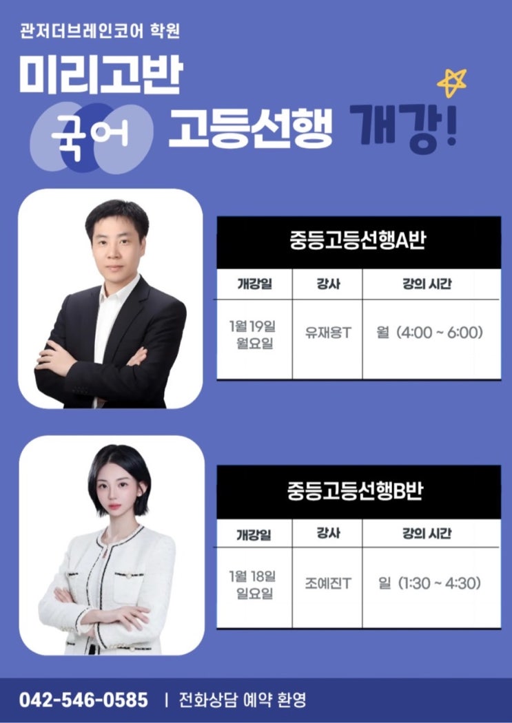 관저 더브레인코어에서 중등 과정부터 고등 국어를 체계적으로 준비하는 미리고반 국어 고등선행 수업이 개강합니다. ✔ 중등 개념을 바탕으로 고등 국어 학습에 자연스럽게 연결 ✔ 독해·문학·문법의 핵심 구조 이해 중심 수업 ✔ 학년 상승 전, 국어 학습 방향을 잡고 싶은 학생에게 추천 중등고등선행 A반 개강일: 1월 19일(월) 시간: 월 16:00 ~ 18:00 강사: 유재용 T 중등고등선행 B반 개강일: 1월 18일(일) 시간: 일 13:30 ~ 16:30 강사: 조예진 T 문의 및 상담 관저 더브레인코어학원 042-546-0585 (전화·방문 가능) ※ 반별 정원제로 운영되며, 선착순 마감될수있습니다. <img src="https://blogthumb.pstatic.net/MjAyNjAxMTJfMTI0/MDAxNzY4MjIwNDUyNjgw.DlSRwqfQPtM_HQ2KUUcXARtFsBimBCP6h8yvpkG64xUg.UwmGnEaEzzeFGlIuMvjRGzVAUdGUkawk2l3rzCw4zS4g.JPEG/KakaoTalk_20260112_203054635.jpg?type=s3" />