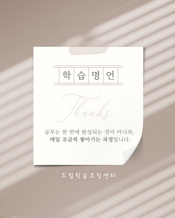 안녕하세요^^ 드림학습코칭센터입니다! 오늘은 지칠 때마다 마음을 다잡을 수 있는 학습 동기 부여 명언들을 모아 아이들과 학부모님들께 소개해 드리려고 합니다 ^^ 학습과 관련된 명언들은 대부분 꾸준함, 도전, 그리고 실천의 중요성을 강조합니다. 작은 습관 하나가 큰 성과로 이어지고, 포기하고 싶은 순간이 오히려 성장의 기회가 되기도 하죠. 꾸준함의 힘 “시작이 반이다.” → 시작하는 용기가 가장 큰 힘입니다. “공부는 타고나는 게 아니라, 만들어가는 것이다.” → 꾸준한 노력으로 실력을 쌓을 수 있습니다. “오늘의 노력이 내일을 만든다.” → 지금의 작은 공부가 미래를 결정합니다. "공부는 한 번에 완성되는 것....... <img src="https://blogthumb.pstatic.net/MjAyNjAxMTJfMTY2/MDAxNzY4MTk5MTE3MjIx.mAWISlWH7l5yrmarIjqVg4FVjGtNRNsGVPFqRTL_bW0g.jYatsH_Pge1jQxG6RAnNWHGIqN63-RHpZ4MWierDqV4g.JPEG/%B8%ED%BE%F0_%C7%A5%C1%F6.jpg?type=s3" />