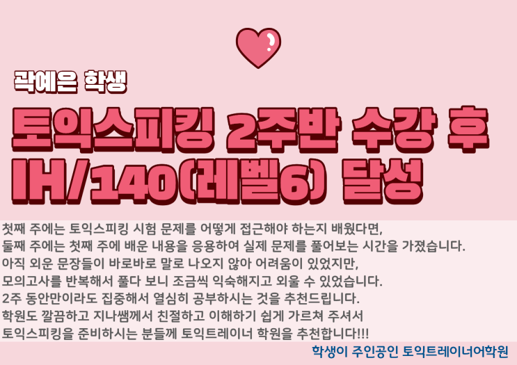 오늘은 토익트레이너에서 꾸준한 모의고사 참여와 지나쌤의 만능 표현집으로 좋은 점수를 얻은 곽예은 학생의 후기를 알아봅시다 (๑•᎑•๑) 1. 첫째주 후기 토익스피킹 시험의 문제가 어떻게 출제되는지 파트별 특징에 대해 배우는 시간을 가졌습니다. 지나쌤께서 이해하기 쉽게 설명해 주셔서 수업 내용을 잘 따라갈 수 있었습니다. 첫 수업에는 부끄러워서 말을 잘 하지 못했지만, 다른 수강생분들과 함께 연습하다 보니 점차 자신감이 생겼습니다. 2. 둘째주 후기 첫째 주에는 토익스피킹 시험 문제를 어떻게 접근해야 하는지 배웠다면, 둘째 주에는 첫째 주에 배운 내용을 응용하여 실제 문제를 풀어보는 시간을 가졌습니다. 아직 외운 문....... <img src="https://blogthumb.pstatic.net/MjAyNjAzMThfMTM4/MDAxNzczODMwMTc3ODQw.iY2m6vo2FGPt14qJldhtnQxnD3LWdM-c-iRFCbGuFrYg.r_PNaYgJcD9kwhGEA4jAqRMWt5ECCK4yXwNukxwrmfIg.PNG/%B0%FB%BF%B9%C0%BA.png?type=s3" />