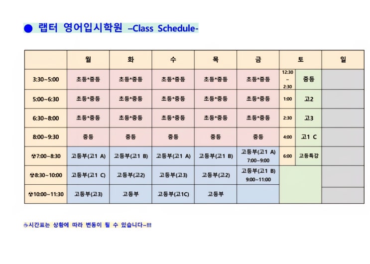 2026년도 랩터 영어학원 확정시간표