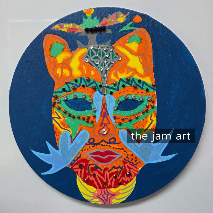 안녕하세요! 오늘은 최근 작업한 원형 캔버스 마스크 시리즈를 소개해 드리려고 합니다. 평범한 평면 회화를 넘어, 다양한 오브제와 강렬한 색채를 사용해 각기 다른 페르소나를 표현해 보았는데요. 비즈와 스톤이 빛을 받을 때마다 변하는 마스크의 표정들이 무척 매력적인 작업이었습니다. 작품 하나하나 살펴보기 1. 심해의 신비로움을 담은 블루 마스크 가장 먼저 보여드릴 작품은 깊은 바다를 연상시키는 남색 배경의 마스크입니다. 강렬한 오렌지색과 대비를 이뤄 시선을 확 사로잡죠? 눈가에 수놓아진 투명한 비즈들이 마치 밤하늘의 별이나 바닷속 기포처럼 반짝여요. ✨ 작업 포인트: Mixed Media (혼합 매체) 2. 태양의 정열을 닮....... <img src="https://blogthumb.pstatic.net/MjAyNjAxMTRfMTI2/MDAxNzY4MzY5NTE5MjU4.JXD4JMLKNoG6RoptYIbnKmDgN18DqYI28H8cZHWdvgcg.tRTvPhrPNLBGQM5bX8gHWXV5AF2sLwygCTNoJBIGAf4g.JPEG/KakaoTalk_20260113_140402020_25.jpg?type=s3" />