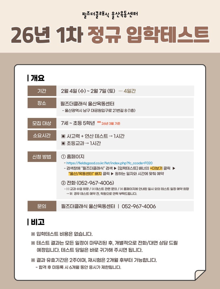 필즈더클래식 26년 1차 정규입학테스트 일정 안내입니다. 추가 문의는 학원(052-967-4006)으로 전화 주세요. ** 아래 이미지를 클릭하시면 입학테스트 예약 링크로 바로 연결됩니다. ** <img src="https://blogthumb.pstatic.net/MjAyNjAxMTlfMTMz/MDAxNzY4ODE0MzcyOTA0.GRTlTCWQjCnzWXvTzC14DzPRPV31Rq0mVC7nlJ9zo2Ig.tRIwGfIbvcitUJF9gc4ZxjwoompQ1fV8DIIniVwHez4g.JPEG/26%B3%E2_1%C2%F7_%C0%D4%C5%D7_%282%29.jpg?type=s3" />