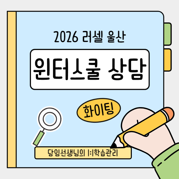 안녕하세요, 서연고·의치약 전문관 러셀울산학원입니다. 윈터스쿨이 시작되며 전 학생을 대상으로 담임선생님과의 1:1 기초상담이 진행되고 있습니다. 오늘은 그 상담 현장을 간단히 소개해드리겠습니다 ✔️ 윈터스쿨 기초상담 엿보기 , 공부 방향, 처음부터 함께해요 ☺️ 윈터스쿨이 시작되면 러셀울산학원에서는 전 학생을 대상으로 담임선생님과의 1:1 기초상담이 진행됩니다. 공부를 본격적으로 시작하기 전, 학생 한 명 한 명의 상황을 살펴보고 지금 필요한 공부 방향부터 차근차근 정리하는 시간입니다. 윈터스쿨 기초상담, 이렇게 진행돼요 기초상담에서는 입학원서를 통해 담임선생님이 학생들의 기존 공부 진도와 성적을 파....... <img src="https://blogthumb.pstatic.net/MjAyNjAxMjBfMTc3/MDAxNzY4OTE4MDQ1MjUw.dfakbNvS-RsEIFP58ZkkSYY34aNK9crzX14DSMPYMI8g.TYFR58s91K6IihUyFhRLnZcTvcXADt_YVsYx5AR098cg.PNG/%C1%A4%BC%AD%C7%F6%28%BA%ED%B7%CE%B1%D7_%BD%E6%B3%D7%C0%CF%29-001_%281%29.png?type=s3" />