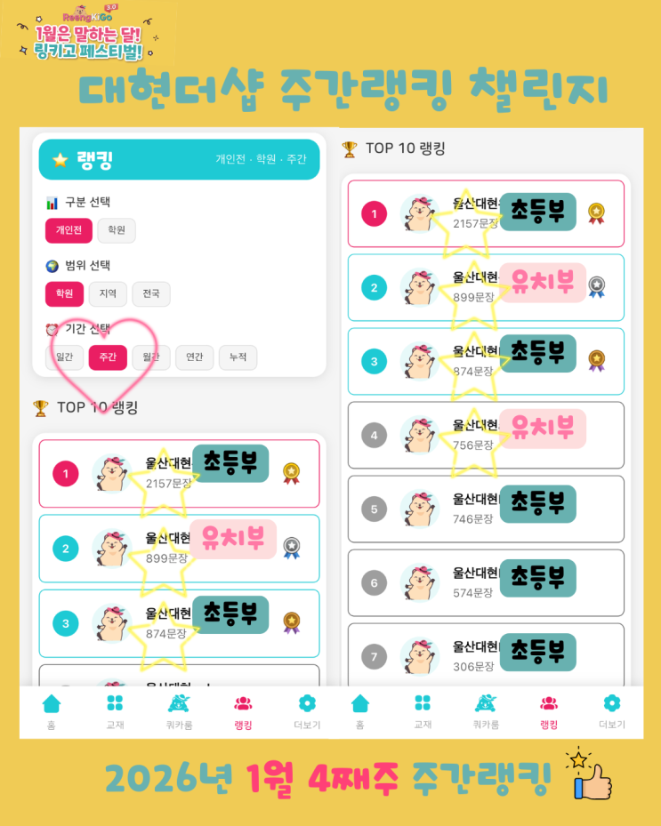 영어로 소극적이던 아이, 링키고 3.0으로 말하는 즐거움을 만나다 안녕하세요. 링키영어 울산 대현더샵점입니다. 지난주 주간 랭킹 이벤트 1/19(월) ~ 1/25(일) 주간 랭킹 이벤트가 진행되었습니다. 링키고 주간 랭킹은 밤 11시 30분까지 집계되는 일정으로, 늦은 시간인 점을 고려해 결과는 인스타그램을 통해 먼저 안내드렸습니다. 1~4위가 유치부 2명, 초등부 2명이 고르게 이름을 올리며 각자의 자리에서 꾸준히 참여해 준 모습이 인상적이었습니다. 순위에 오른 친구들 모두 축하합니다. 하지만 주간 랭킹 이벤트를 진행하면서 제가 더 중요하게 보고 싶은 것은 순위 그 자체가 아닙니다. 주간 랭킹의 목적은 경쟁이 아니라 지속....... <img src="https://blogthumb.pstatic.net/MjAyNjAxMjZfNzUg/MDAxNzY5MzU4MzQxNTM0.NQKlnzTZ9yxpVycHjcASNe3-JgORBsBsr0JslWvHtSkg.3c4tL7V-hP74BfGrsxyjUTaKpFTiKxdnJmDDA0AUXN4g.PNG/26.01%C1%D6%B0%A3%B7%A9%C5%B7%B9%DF%C7%A5.png?type=s3" />