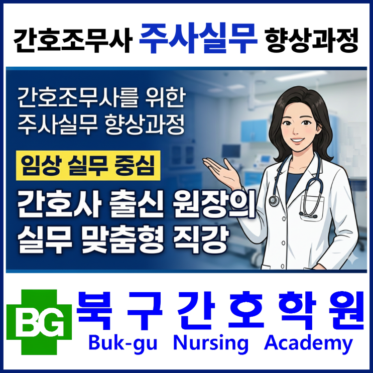 1️⃣ 간호사 출신 원장의 직접 강의 본 과정은 간호조무사 주사실무 향상과정으로, 이론 위주의 교육이 아닌 임상실무 중심 교육을 통해 실제 병·의원 현장에서 바로 적용 가능한 주사실무 역량 강화 과정입니다. 간호사 출신 원장의 실무 맞춤형 직강 임상 경험이 풍부한 간호사 출신 원장이 직접 강의를 진행하며, 실제 현장에서 자주 발생하는 상황 실무를 중심으로 간호조무사 선생님의 눈높이에 맞춘 실무 중심 주사교육을 제공합니다. 2️⃣ 간호조무사 주사실무 향상교육 ○교육일정: 2026년 상반기 (3월~6월) ○교육시간: 오전 11시 ~ 오후 4시 ○교육비용: 20만 원 ○교육인원: 10명 (각 회차 별, 집중교육 진행) ○제출서류: 간호조무....... <img src="https://blogthumb.pstatic.net/MjAyNjAyMDNfNzAg/MDAxNzcwMTIwNDA5MDY3.ZyVI7bTqBc1CXuXNbG3llNje1uHyqv1_wF8oajMTH80g.zQcmRoNJS0KTvDYomv1WU-6BLPji0JDCZhybv1hbHSEg.PNG/%B0%A3%C8%A3%BB%E7%C3%E2%BD%C5%BF%F8%C0%E5_%C1%D6%BB%E7%BD%C7%B9%AB%B1%B3%C0%B0.png?type=s3" />