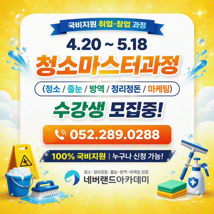 안녕하세요! 울산 네버랜드 아카데미 학원입니다. 2026년 4월 청소 마스터 과정 개강 일정을 안내해 드리겠습니다. 수강일정 : 2026.4.20~ 2026.5.18 돈 되는 취,창업 뭐가 있을까요?? 지속적으로 소자본 창업, 좋은 일자리에 대한 관심이 이어지는 분야. 바로 "청소"입니다!! 취업부터 창업까지 다양한 프로그램의 커리큘럼을 한곳에서!!! 전국에서 오직 "네버랜드 아카데미" 에서만 가능합니다! 청소 마스터 과정은 청소 (입주, 계단, 사무실, 유리 청소, 바닥 세척기, 건물관리) 줄눈/정리 정돈/매트리스케어/ 방역/창업마케팅 등 창업 및 취업을 위한 다양한 과정을 20일 내에 습득하실 수 있는 과정입니다. 고용 플러스....... <img src="https://blogthumb.pstatic.net/MjAyNjAzMjlfMjYg/MDAxNzc0NzUxNDA3MzA1.YgKge4hWZcH5xg5IDU1HklkToF7zQlQL4hDw0j8M4cEg.VH9M7uiwAJBqW5l2yKXrbMNQVH8wdd_kTFXiC7THvAMg.GIF/%BF%EF%BB%EA%C3%BB%BC%D2.GIF?type=s3" />