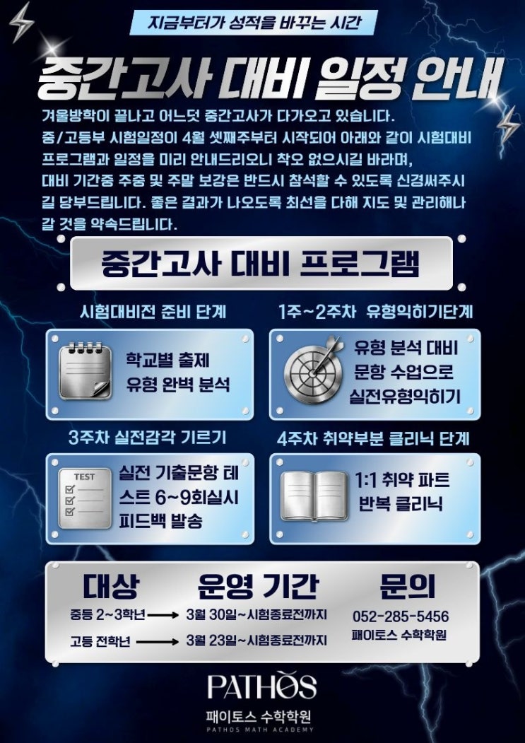 겨울방학이 끝난 이후의 학습 흐름은 단순한 복습이 아니라 성적을 결정짓는 가장 중요한 시기입니다. 특히 중·고등부의 경우 시험 범위가 빠르게 확장되고 난이도도 높아지기 때문에 이 시점에서 어떻게 준비하느냐에 따라 같은 공부를 해도 결과는 크게 달라지게 됩니다. 많은 학생들이 열심히 공부를 하고 있음에도 성적이 기대만큼 나오지 않는 이유는 명확합니다. ✔ 출제 유형에 대한 이해 부족 ✔ 실전 대비 경험 부족 ✔ 취약 단원에 대한 정확한 보완 부족 즉, 문제의 양이 아니라 “준비 방식”이 성적을 좌우합니다. 패이토스수학학원은 단순 문제풀이가 아닌 결과를 만드는 시험 대비 시스템으로 운영됩니다. 이번 중간고사 대비 역....... <img src="https://blogthumb.pstatic.net/MjAyNjAzMzFfOTMg/MDAxNzc0OTYxMTU1MzQw.zuLE9vHIE8taUbvsjbUM-1oJKyoyw-0gVMsYQf1pRSgg.3Y_vOTBtpq2kk1Dda5AOvBCW2xMhIHXfZpJ70Bb8fnog.JPEG/111.jpg?type=s3" />
