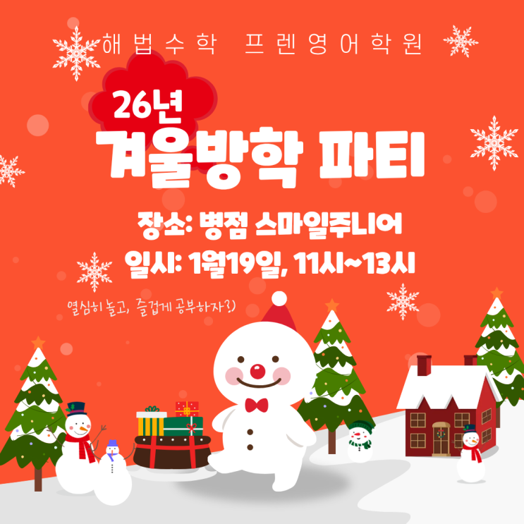 학원 방학 파티 안내 재원생들을 위한 즐거운 방학 파티를 준비했습니다! 일시: 1월 17일(토) 오전 11시 ~ 12시 장소: 병점 스마일주니어 대상: 재원생 참가비: 무료 신청 방법: 문자 신청 많은 참여 바랍니다 <img src="https://blogthumb.pstatic.net/MjAyNjAxMTFfMTYz/MDAxNzY4MTAwMjM5MDg4.94og1xMdn-Zr3-FhuruReovYOhbQMmLOugAEeQxCa0wg.cjoKc6WsJ9Afi6VHB8Znl7ngG60yrHGt02lWNomGGWog.PNG/%C1%A6%B8%F1%C0%BB_%C0%D4%B7%C2%C7%D8%C1%D6%BC%BC%BF%E4._%281%29.png?type=s3" />