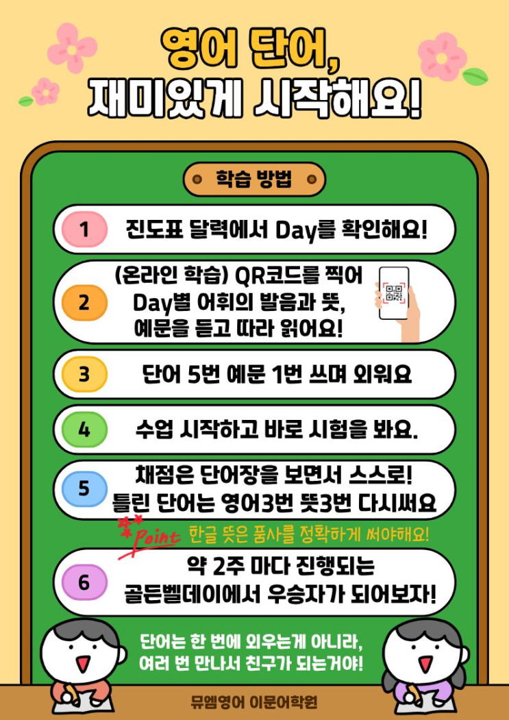 공부를 하다 보면 분명 배웠던 단어인데 [이게 뭐였죠?] [제가 배웠었어요?] 라며 이야기 하는 아이들이 수두룩.. 그래서 뮤엠영어 조원캠퍼스에서는 이번 겨울 방학을 맞이해 새로운 단어 학습 시스템을 도입하였습니다! 단어 집중 학습 프로그램을 통해 -수준별 핵심 단어를 집중적으로 학습 -단어 테스트 및 복습 시스템 도입 -읽기/쓰기/말하기로 확장되는 학습 구성 등을 목표로 할 수 있게 됩니다! 아이들은 단어 책 앞에 붙어있는 진도표를 통해 각 날짜에 맞는 데이의 단어들을 공부하고, 정규수업 전 테스트를 진행합니다! 스스로 채점하는 모습도 너무 귀엽죠 ㅎㅎ 아이들이 수월하게 해줄 지 걱정도....... <img src="https://blogthumb.pstatic.net/MjAyNjAxMTZfMTU5/MDAxNzY4NTM3OTM4ODg0.EBIoU7xIrCUF8g9vBMsxtPUUm6Y-IGD5PhCPAZ9p7gIg.1ryXzz96hLSAjnRxt59f4IASrmqTCoJIX-GgZrLrkwMg.PNG/image.png?type=s3" />