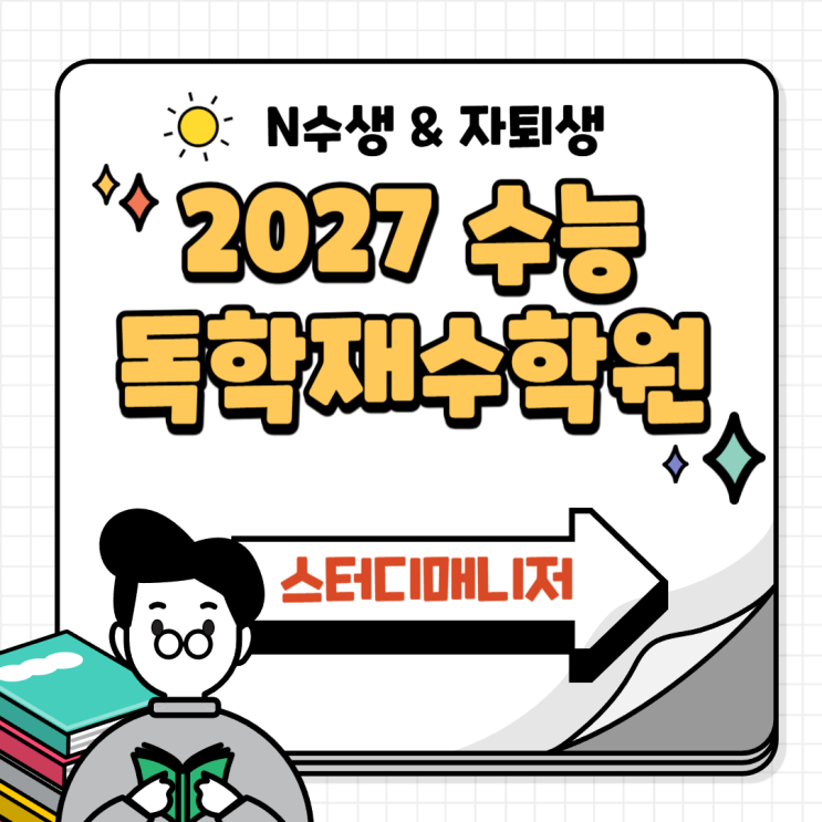 안녕하세요! 수원 독학재수학원 스터디매니저 입니다! 2026 수능 영어가 워낙 어렵게 나오는 바람에 학생들이 수시에서 최저를 못 맞추고, 더불어 통합수능 마지막해이기에, 올해는 재수생이 더 증가할 것으로 예측되고 있습니다! 스터디매니저는 다년간의 학습 노하우와 축적된 데이터를 바탕으로 올해도 독학재수학원의 원생을 전격 모집합니다! 스터디매니저 독학재수학원 생활관리+학습관리 1:1 과외식 수업 평가원/사설 모의고사 수능 후 대입 컨설팅까지! 심층 상담을 통한 개인별 맞춤 학습 계획 (교재 및 인강 선정) (국수영 1:1 수업 결정) (공부법 코칭 및 과목별 밸런싱) 주1회 수학/영어 1:1 질의응답 시간 제공 국어/수학/영어 1:1 ....... <img src="https://blogthumb.pstatic.net/MjAyNjAxMTdfMzAw/MDAxNzY4NjE5MTczODUy.1xmWHv0tKoO-77J8a1dTiDEkaSZDJ1htZqdR7DOKVAAg.__91Tts3xgutbT-cv5nN_yS5vHyqNByfz4ldJ70MZVAg.PNG/2027_%B5%B6%C0%E7.png?type=s3" />