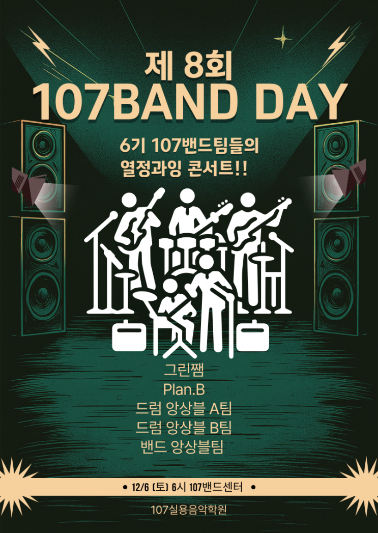 제8회 107 BAND DAY 후기 안녕하세요, 분당음악학원 107실용음악학원입니다. 지난 12월 6일, 8회 107밴드 데이가 성공적으로 마무리되었습니다! 총 5개 팀의 멋진 무대!! 공연 후기 시작하겠습니다!! 1. 그린쨈 그린쨈은 보컬 없이 연주만 진행하는 팀으로, 107밴드에서 처음으로 만들어진 연주팀입니다. 처음부터 끝까지 새로운 도전을 이어가며 준비했던 이 팀은 정말 흥미로웠습니다. 기존 곡들을 연주곡으로 편곡하고, 각 파트에 솔로를 추가하는 작업은 개개인의 실력을 크게 성장시키는 과정이었습니다. 그 과정에서 가끔은 어려운 순간도 있었지만, 결국 멋지게 공연을 마무리하고, 팀원들이 함께 여행을 떠나는 모습을 보며 107밴드의 한....... <img src="https://blogthumb.pstatic.net/MjAyNTEyMzBfMjAg/MDAxNzY3MDg4MjEzMjk5.DHX-VibFyij7fSdrF8dMyJbdbBYzhorgdTtWBPY2km8g.Kx-FOX3dbEVZstb041uYh-wkpt_ZB8HYzKz1ud7Xa-wg.PNG/8%C8%B8_%B9%EA%B5%E5%B5%A5%C0%CC_%C6%F7%BD%BA%C5%CD.png?type=s3" />