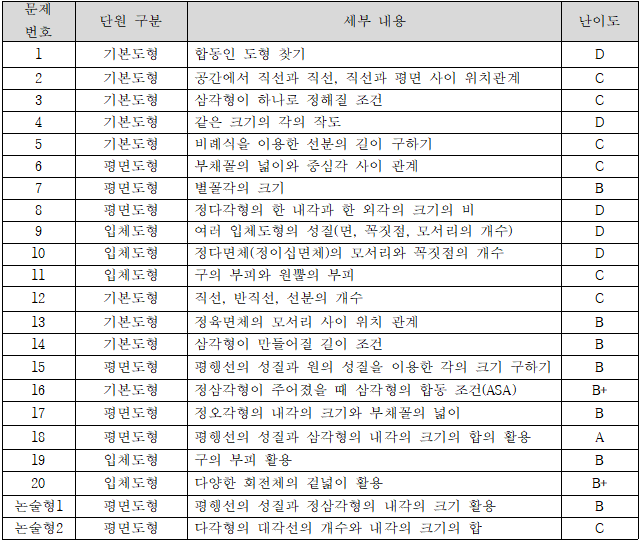 2025학년도 2학기 기말고사 내정중1 1. 시험 범위 : 기본도형, 평면도형, 입체도형 2. 분석 (1) 문제 구성 : 선택형(20문제) + 논술형(2문제) (2) 경향 총평 ① 문제 구성 및 특징 이번 시험은 기본도형~입체도형 전 단원을 고르게 출제하였으며, 선택형 20문제와 논술형 2문제로 구성되었다. 전체적으로 기본 개념을 정확히 알고 있는지를 묻는 문제가 다수를 차지했고, 계산 자체보다는 조건 해석과 개념 적용에 초점이 맞춰진 시험이었다. 단순 암기형 문제(D, C)는 비교적 안정적이었으나, 중후반부로 갈수록 여러 개념을 함께 사용하는 문제가 배치되었다. 특히 평면도형 단원에서 각의 성질을 복합적으로 활용하는 문제가 변별력 역할을 했....... <img src="https://blogthumb.pstatic.net/MjAyNjAxMDNfMTg5/MDAxNzY3NDE4NDMwMjk0.76WgtLKAUimmS5fs6g2kvBowEl5YeafnJWE3MBd0pZAg.PYnsrLgjjf6bT4s8kluuV3Sc7JyCgEo76MMDRx16TXcg.PNG/image.png?type=s3" />