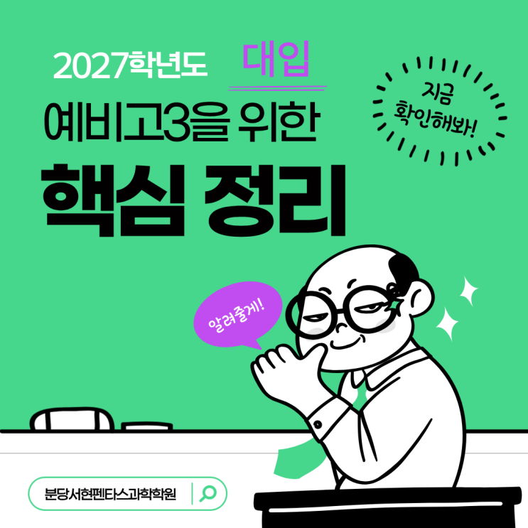 2026년 새해가 시작되었습니다. 이제 정말 새로운 학년을 더이상 미루지 말고 준비해야 하는데요. 그중에서도 올해 대입을 치르는 예비고3이라면 1월과 2월, 두 달을 어떻게 보내느냐에 따라 대입결과가 달라질 수 있으니 그 어떤 겨울방학보다 철저한 계획을 세우고 공부해야 합니다. 분당과학학원인 펜타스과학학원 예비고3 학생들도 그 어느 때보다 비장한(?) 마음으로 공부 중인데요. 올해 처음 대입에 도전하는 예비고3들을 위해 분당서현펜타스과학학원에서 2027학년도 대입의 핵심을 정리해 드릴게요. 2027학년도 대입 일정 예비고3이라면 대입이 어떻게 진행되는지 잘 모를 것입니다. 그러니 일단 올해 자신이 치르게 될 대입의 일정을 알....... <img src="https://blogthumb.pstatic.net/MjAyNjAxMDVfMTg2/MDAxNzY3NTc3MTI1MTM5.wHiqGMpX4FjvTb2rSP7O1-OFNxie5Qx8LhGnpOFkqBwg.W8WofsVJX9OzhePXOiiHP23pbZRcf4ySx1avGRiWhmcg.PNG/%C1%A6%B8%F1%C0%BB_%C0%D4%B7%C2%C7%D8%C1%D6%BC%BC%BF%E4._-_2026-01-05T103821.284.png?type=s3" />